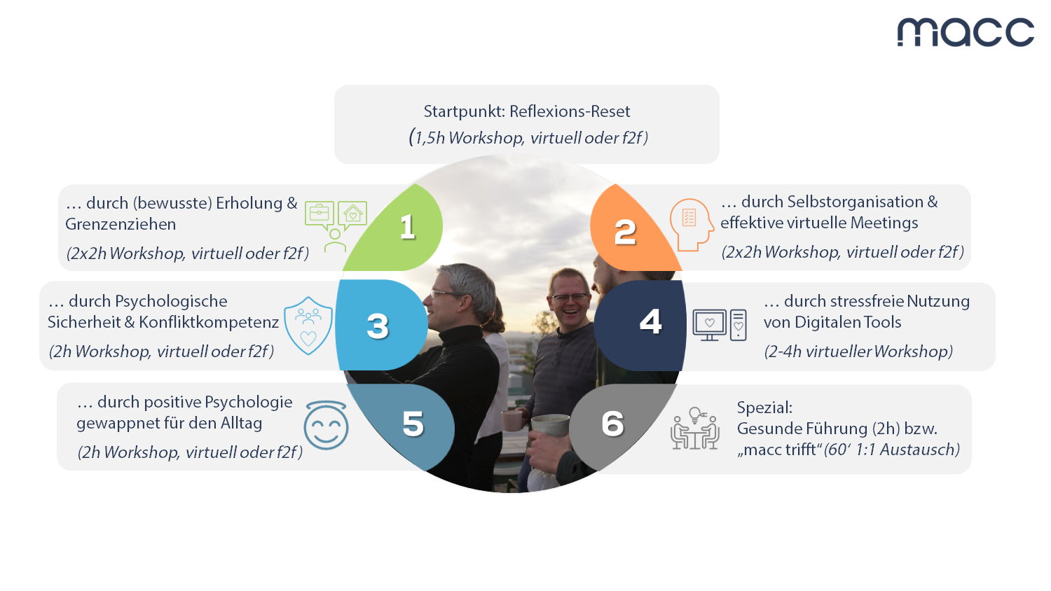 Dieses 1zu1 Format mit einem:r macc-Sparringspartner:in bietet einen sicheren Raum für individuelle Alltagsherausforderungen (z.B. gewinn-bringender Einsatz digitaler Tools bei spezifischer Tätigkeit). Dabei generieren Einzelpersonen z.B. Ideen zum Übertrag des Gelernten auf das eigene Team oder reflektieren die eigene Haltung in Bezug auf den Digitalen Arbeitsalltag. Schwerpunkt dabei ist immer, nachhaltige Gelassenheit im Digitalen Alltag sicherstellen.